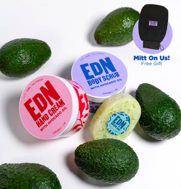 Bring the beauty of sun-kissed California straight to your skin with the EDN Essentials Trio — a curated set featuring our nourishing hand cream, revitalizing body scrub, and avocado-infused loofah soap.